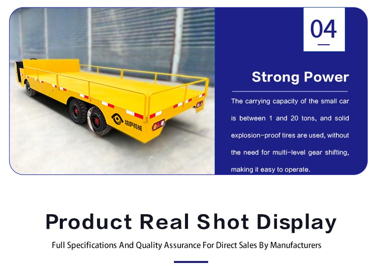 The manually driven Electric Flat Truck is a new type of material handling equipment that combines the advantages of both trackless transfer vehicles and forklifts, offering strong load-bearing capacity and operational flexibility. It eliminates the need for traditional fixed-track designs and instead relies on a high-performance drive system. This allows for greater ground adaptability and stronger power output, making it especially suitable for challenging conditions, such as climbing slopes while carrying heavy loads—an advantage not typically found in ordinary trackless platform vehicles.